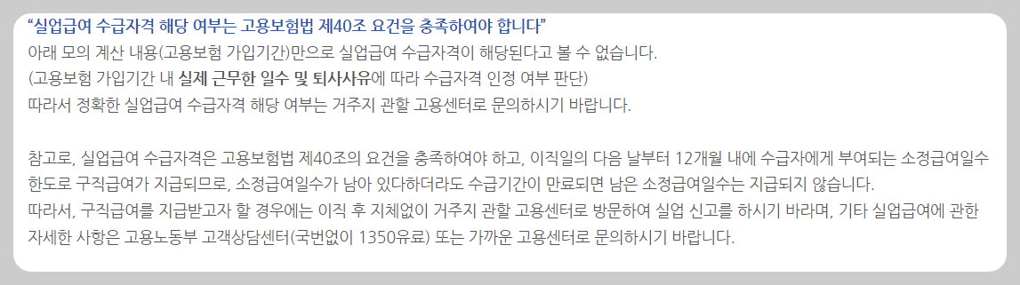 구직급여를 받기 위해서는 고용법 제40조의 요건을 충족해야 합니다. 모의계산의 결과만으로는 실제로 수급자격이 해당되는지 알 수 없습니다. 고용 가입기간 외에도 실제 근무한 일수 및 퇴사 사유 등을 고려하여 수급자격 여부를 판단해야 합니다.