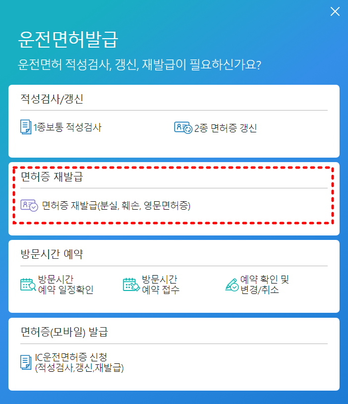 - 재발급: 운전면허증 분실, 훼손, 영문면허증 신청
