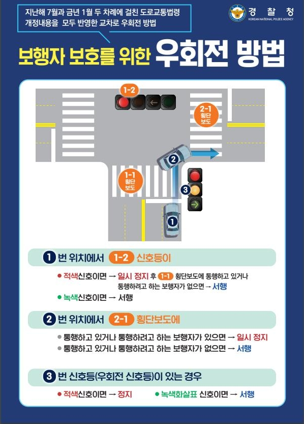 이제 우회전을 할 때에는 꼭 일시정지를 해야 하며, 보행자가 없을 때는 서행하면서 통과해야 합니다.