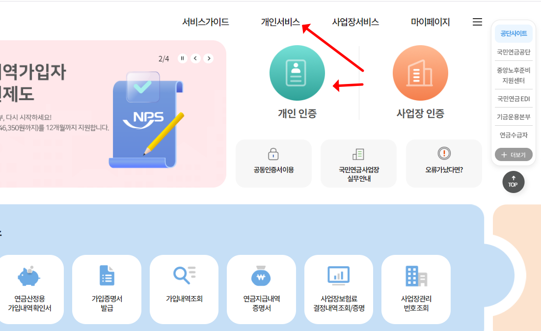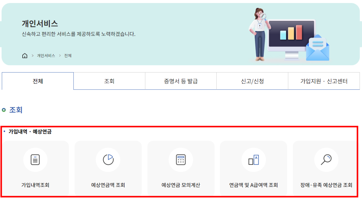수령나이와 금액을 확인하기 위해서는 우선 해당 사이트로 접속해야 합니다. 홈페이지 접속 후 자주찾는 서비스에서 '가입내역 조회' 또는 메뉴 중 개인서비스를 이용하면 됩니다.