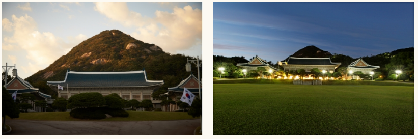 대통령 관저이자 집무실입니다. 건물은 2층에 무궁화실, 인왕실, 충무실, 세종실, 대통령 집무실, 접견실,등이 있습니다. 본관 앞에는 야외 행사와 국가 환영식을 위해 사용되는 거대한 잔디 마당이 있습니다. 타원형 사무실은 의자 입구에서 15m 거리로 꽤 크고, 100m2가 넘습니다.