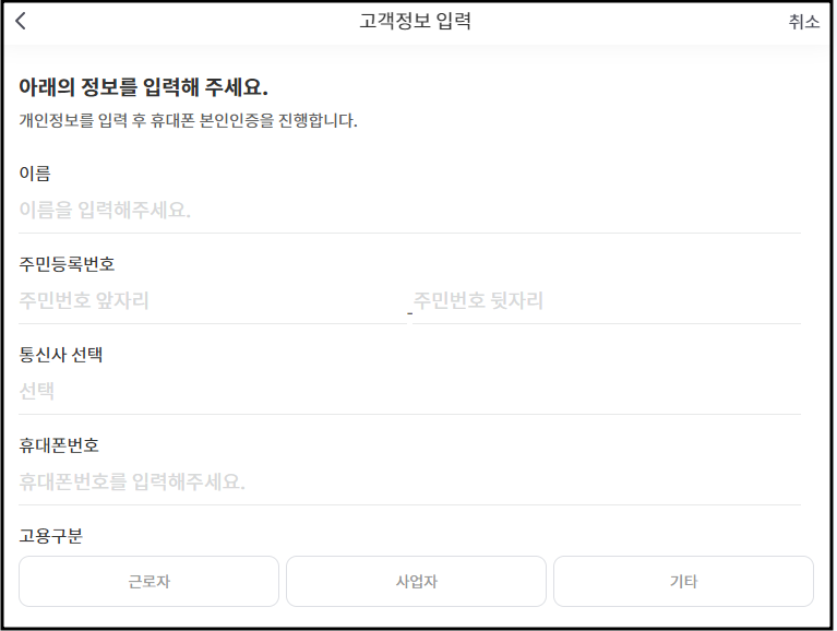 홈페이지에서 신청을 할 경우, 정보를 모두 입력해야 하는데 이름, 주민등록번호, 통신사 선택, 휴대폰전화본호 그리고 근로자/사업자/기타 를 선택해야 합니다.