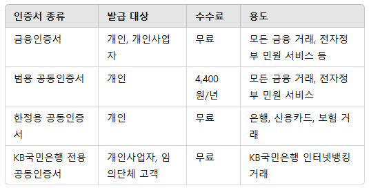 발급 대상과 용도에 따라 다양한 종류의 인증서가 제공되며, 개인 및 기업 고객 모두 안전한 전자거래를 위해 공인인증서를 사용할 수 있습니다.