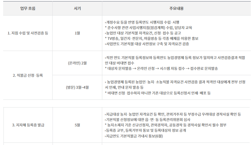3~4월: 오프라인 직불금 신청 접수 (읍·면·동사무소 방문 신청) 5월: 신청자에 대한 등록증 발급