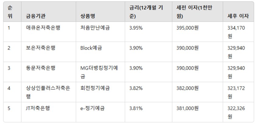 이번에 조사한 데이터에 따르면, 애큐온저축은행의 처음만난예금이 가장 높은 금리를 제공합니다. 12개월 기준 3.95%의 금리를 자랑하며, 예금액 1,000만 원 기준으로 세전 이자는 395,000원, 세후 이자는 334,170원에 이릅니다.
