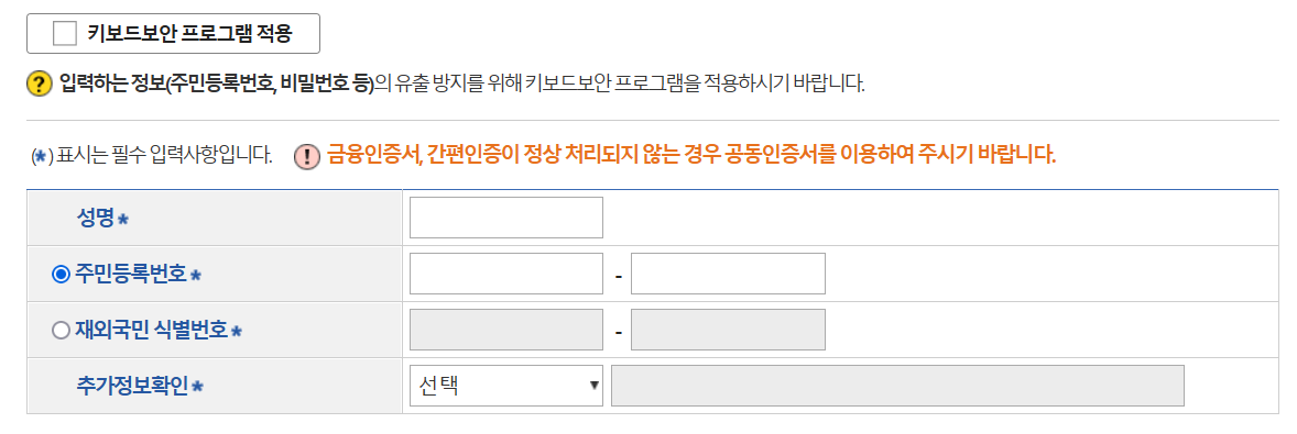 공동인증서, 간편 인증(휴대폰, 카카오톡 인증 등)을 통해 본인 인증을 완료합니다.