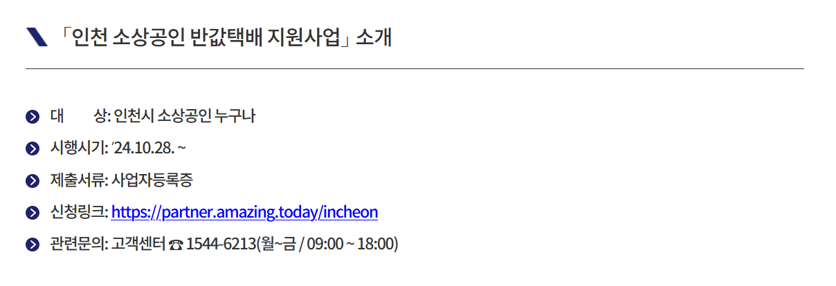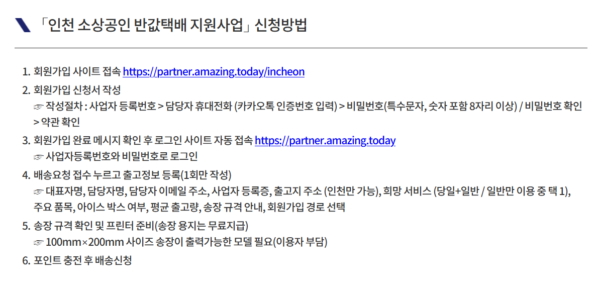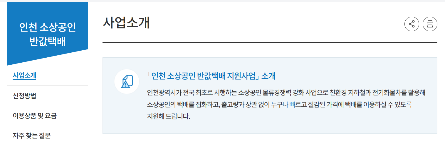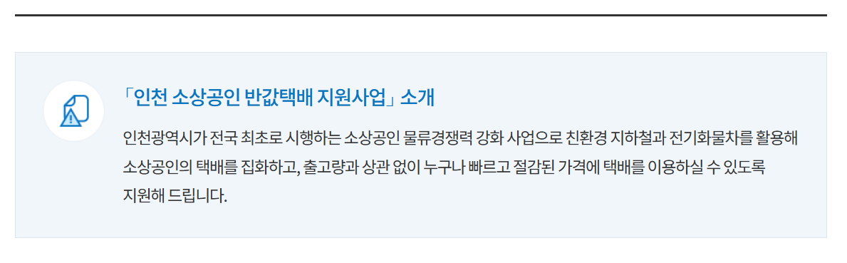 인천시가 주관하고 소상공인시장진흥공단 및 물류사와 연계하여 진행하는 소상공인 배송비 지원 사업입니다. 이 사업은 인천 관내 소상공인이 물류비를 절반 수준으로 줄일 수 있도록 택배비의 50%를 지원해주는 정책입니다.